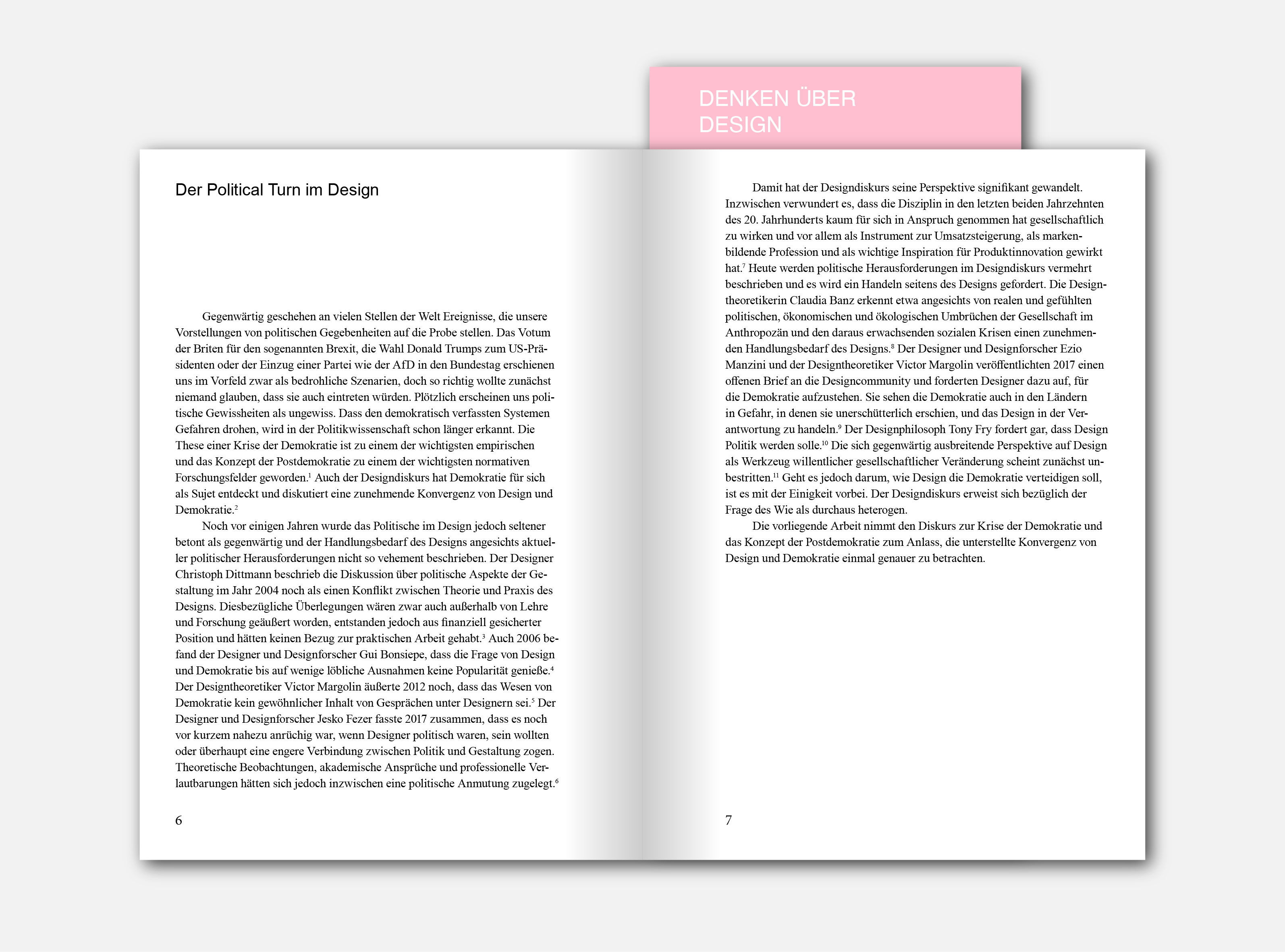 “Inzwischen verwundert es, dass die Disziplin Design in den letzten beiden Jahrzehnten des 20. Jahrhunderts kaum für sich in Anspruch genommen hat gesellschaftlich zu wirken und vor allem als Instrument zur Umsatzsteigerung, als markenbildende Profession und als wichtige Inspiration für Produktinnovation gewirkt hat. Heute werden politische Herausforderungen im Designdiskurs vermehrt beschrieben und es wird ein Handeln seitens des Designs gefordert. [...] Die sich gegenwärtig ausbreitende Perspektive auf Design als Werkzeug willentlicher gesellschaftlicher Veränderung scheint zunächst unbestritten. Geht es jedoch darum, wie Design die Demokratie verteidigen soll, ist es mit der Einigkeit vorbei. Der Designdiskurs erweist sich bezüglich der Frage des Wie als durchaus heterogen.”